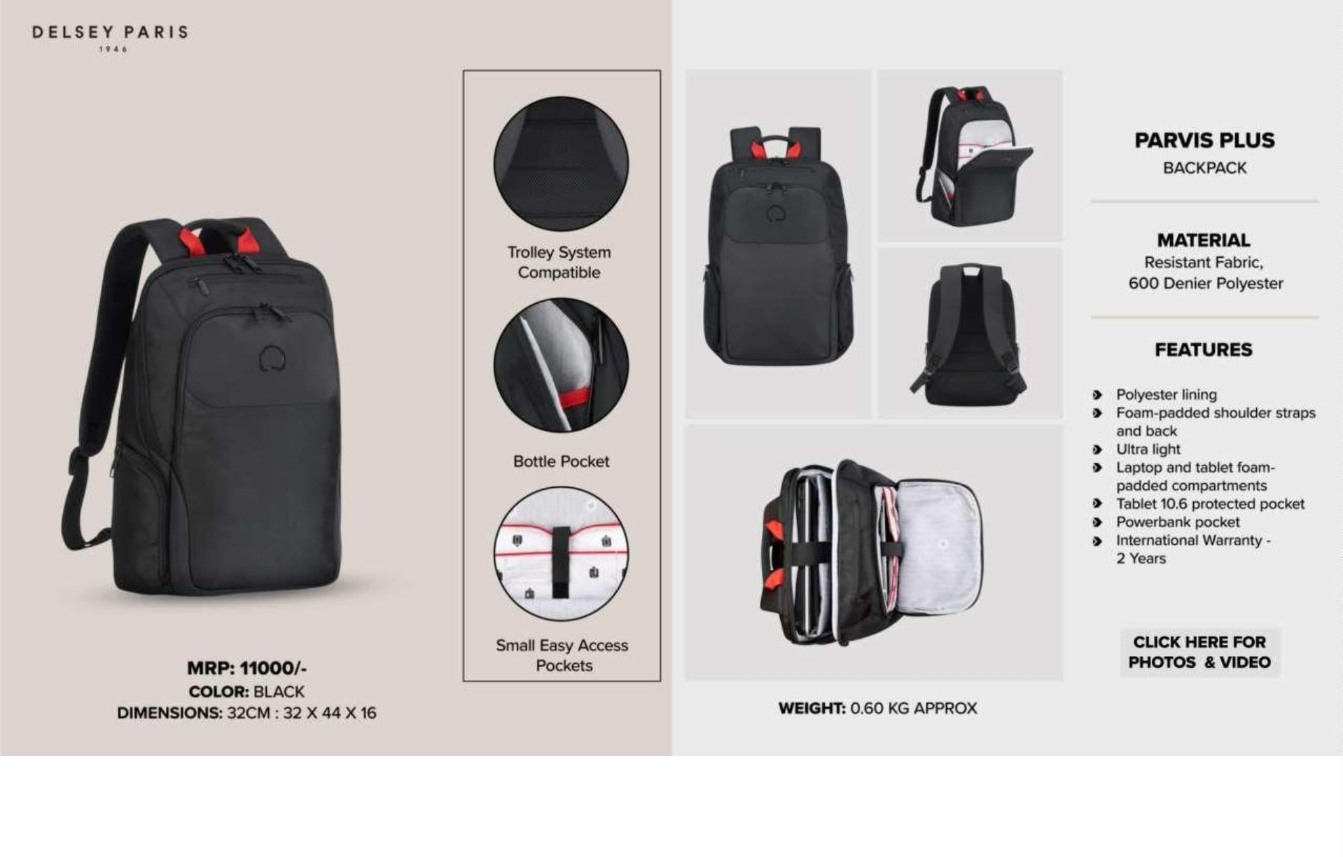 HomeBagsBackpacksCWBBP 36-Delsey Paris CWBBP 36-Delsey Paris SKU: c-1 Category: Backpacks Product ID: 29732 Description Additional information Reviews (0) Description DELSEY PARIS MATERIAL – Resistant Fabric, 600 Denier Polyester. FEATURES Polyester Lining Foam -Padded shoulder straps & back Laptop & tablet foam -padded compartments Ultras light power bank pocket Additional information Weight 2 kg Reviews There are no reviews yet. Be the first to review “CWBBP 36-Delsey Paris” Cancel replyYour email address will not be published. Required fields are marked *Name * Email * Save my name, email, and website in this browser for the next time I comment. Your rating * Rate… Perfect Good Average Not that bad Very poor Your review * I agree that my submitted data is being collected and stored. Related products Add to WishlistRemove from Wishlist Add to Wishlist CWBBP 25-Wildcraft Read more Add to WishlistRemove from Wishlist Add to Wishlist CWBBP 37-Urben Tribe Read more Add to WishlistRemove from Wishlist Add to Wishlist FUR JADEN – BM154 Read more