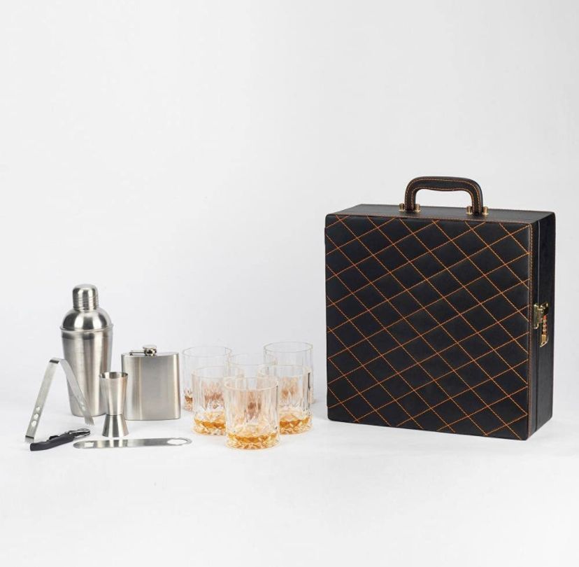 Elevate your entertaining experience with our sophisticated black leather cocktail case, designed for the discerning mixologist. This elegant set includes a premium cocktail shaker, two stylish glasses, and a sleek bottle, all neatly housed in a luxurious leather case that exudes class and functionality. Perfect for both home use and on-the-go gatherings, this all-in-one kit ensures you have everything you need to craft exquisite cocktails, impress your guests, and enjoy a night of refined indulgence. Make every occasion special with this essential addition to your barware collection.