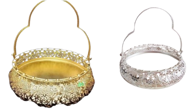 Elevate your home décor with our exquisite decorative baskets or trays, meticulously crafted from durable metal featuring intricate cutwork and filigree designs. These stunning pieces not only serve as functional storage solutions but also add a touch of elegance to any room. Perfect for organizing essentials or displaying cherished items, their artistic detailing makes them a captivating focal point in your living space. Transform your home with this blend of beauty and practicality, and make a statement that reflects your unique style.